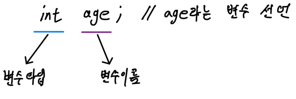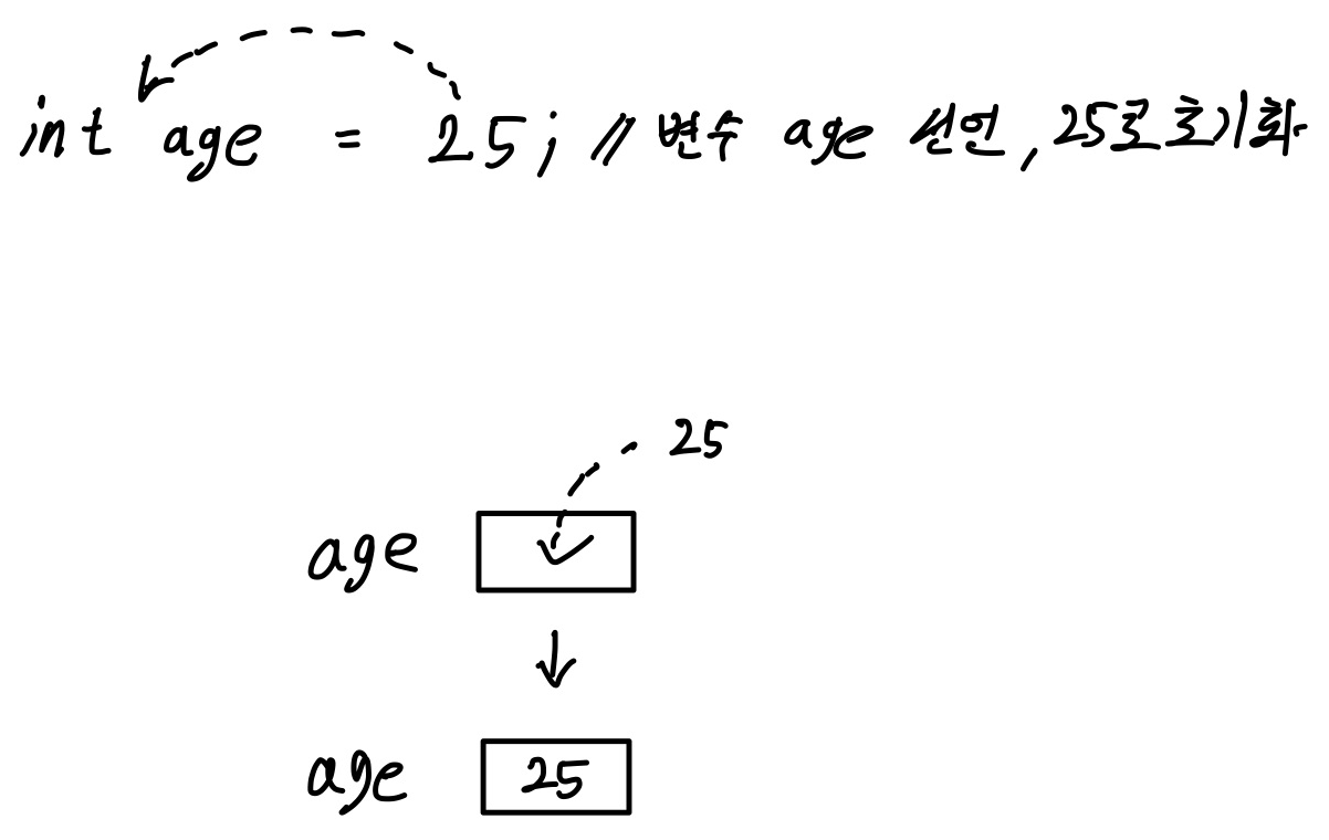 - 변수 선언: 메모리의 빈 공간에 변수 타입에 알맞은 크기의 저장공간 확보, 이 저장공간은 변수이름을 통해 사용 가능
