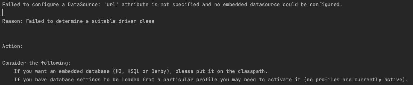 Failed to configure a DataSource 에러가 발생하는 이유는 Database에 연결할 때 필요한 정보가 없기 때문이다. 주로 스프링 프레임워크를 이용해 프로젝트를 구성하는 초기에 발생하는 문제
