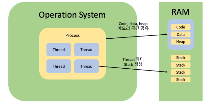 - 스레드는 프로세스 내에서 각각 Stack만 따로 할당받고 Code, Data, Heap 영역은 공유