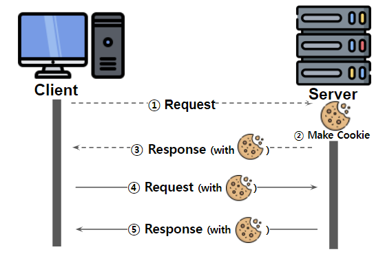 - 사용자가 사이트에 한 번 로그인하면 유효기간이 끝날 때까지 더 이상 아이디와 비밀번호를 입력하지 않아도 되도록 사용자가 이미 서버로부터 인증받았음을 증명해 주는 세션이라는 증서(id)가 필요